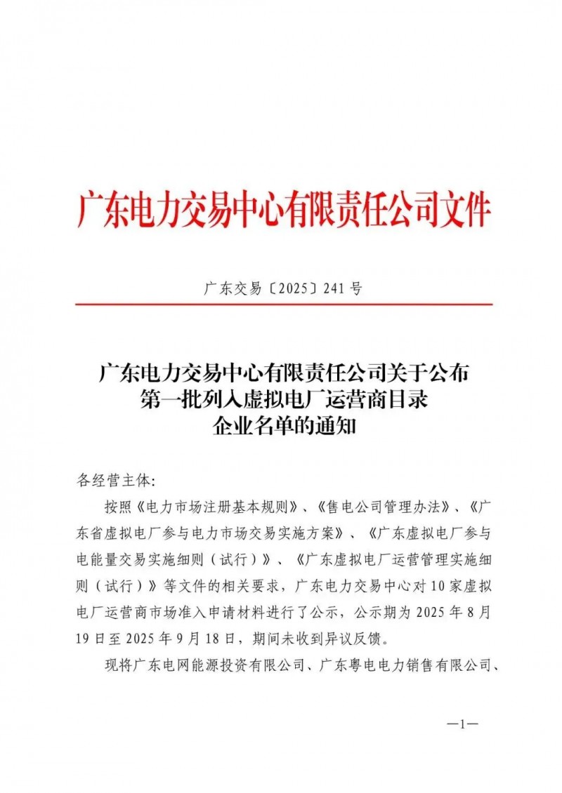 此次名單確定依據(jù)《電力市場注冊(cè)基本規(guī)則》《售電公司管理辦法》《廣東省虛擬電廠參與電力市場交易實(shí)施方案》等多份文件要求。此前,廣東電力交易中心已對(duì)10家虛擬電廠運(yùn)營商的市場準(zhǔn)入申請(qǐng)材料進(jìn)行公示,公示期為2025年8月19日至9月18日,公示期間未收到異議反饋。