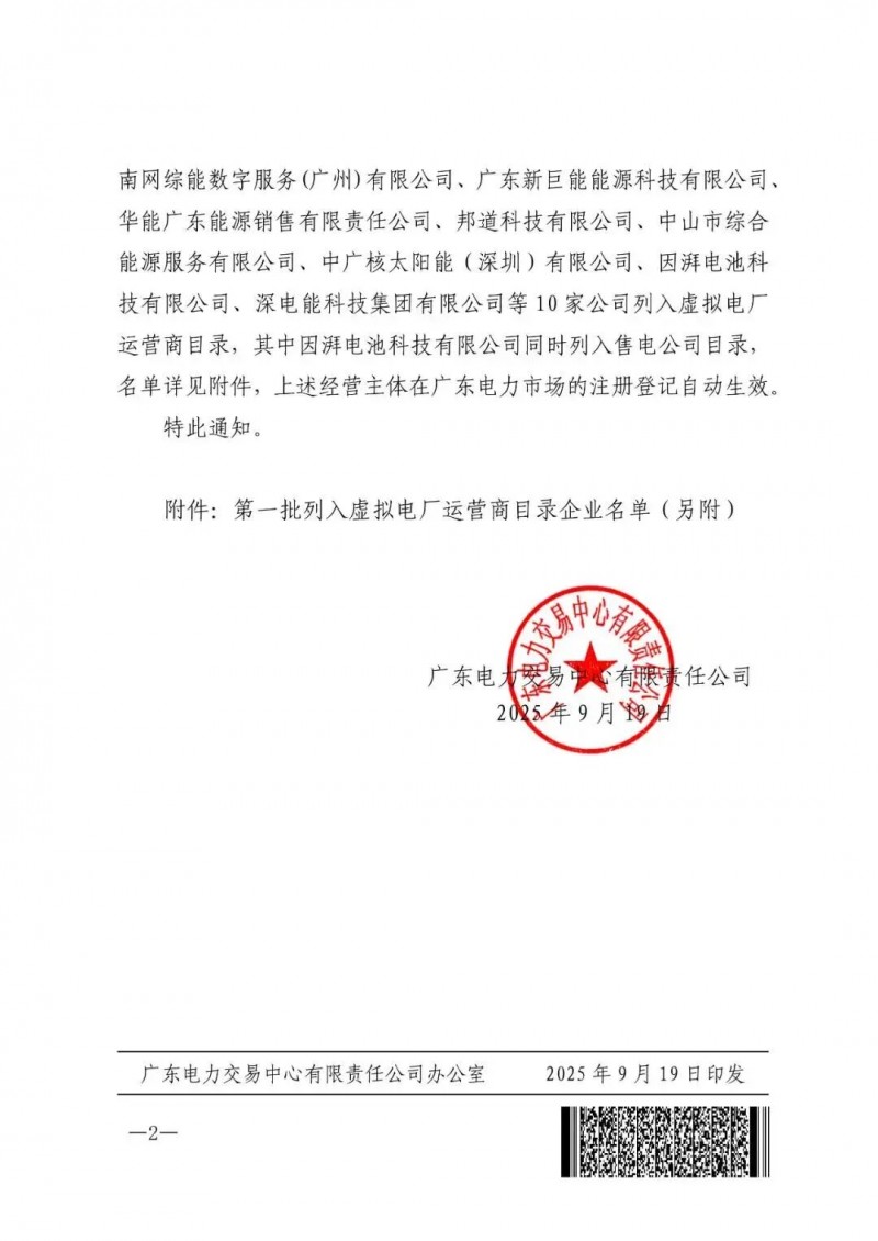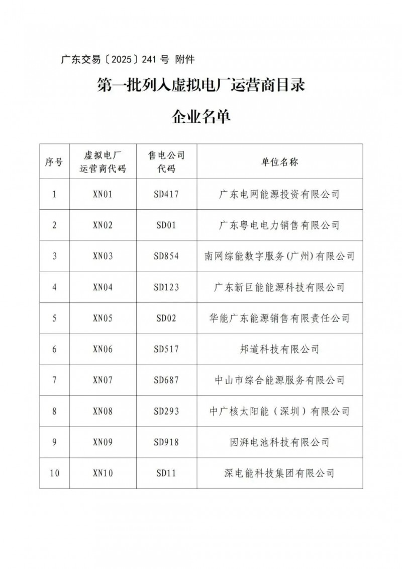 通知明確,上述10家經(jīng)營主體在廣東電力市場的注冊(cè)登記自動(dòng)生效,名單詳情可查閱附件《第一批列入虛擬電廠運(yùn)營商目錄企業(yè)名單》。