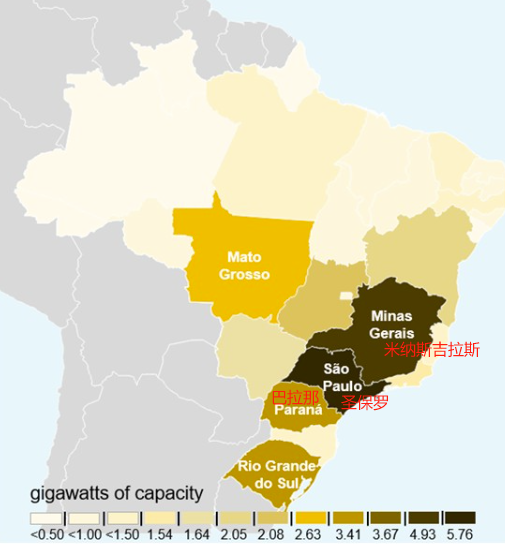 在集中式發(fā)電方面,裝機容量最大的州分別為米納斯吉拉斯州(7.41GW)、巴伊亞州(2.40GW)和皮奧伊州(2.09GW)。