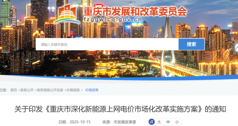 根據《國家發展改革委 國家能源局關于深化新能源上網電價市場化改革 促進新能源高質量發展的通知》(發改價格〔2025〕136號)要求,結合我市實際,市發展改革委、市經濟信息委、市能源局、華中能源監管局研究制定了《重慶市深化新能源上網電價市場化改革實施方案》,經市政府同意,現印發給你們,請認真組織抓好落實。