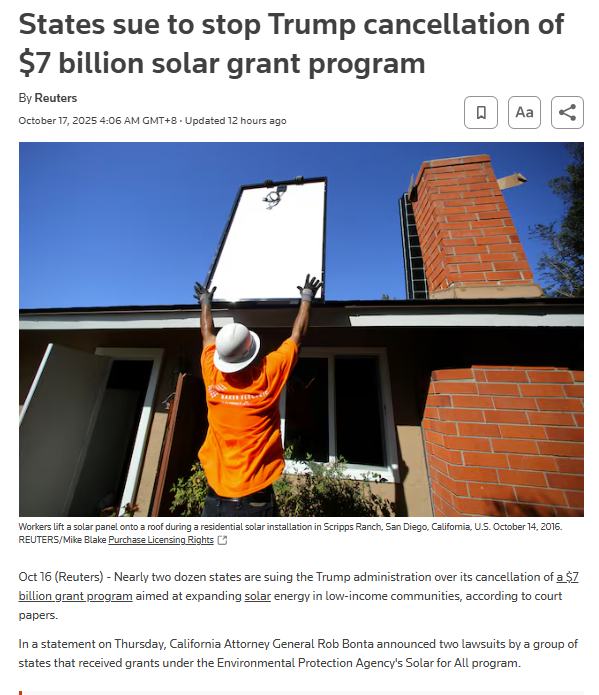 如果順利實施,該計劃預(yù)計能為100萬美國家庭減少至少20%的電費,每年節(jié)省約3.5億美元。然而,今年8月7日,美國環(huán)保署署長李·澤爾丁突然宣布終止該計劃,并收回了已撥付資金的約90%。